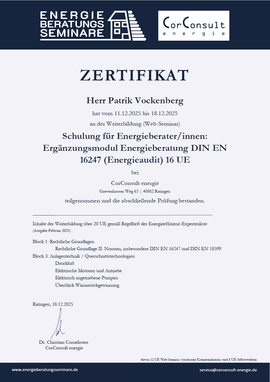 Wir freuen uns, Ihnen mitteilen zu können, dass wir uns erfolgreich zum Energieauditor nach DIN EN 16247 zertifiziert haben.